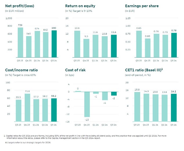 Strong quarterly results: Net profit of EUR 690 million and 11.6% return on equity, driven by improved net interest income, strong fees and net impairment releases.