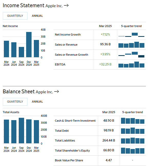 Apple posted quarterly revenue of $95.4 billion, up 5 percent year over year, and quarterly diluted earnings per share of $1.65, up 8 percent year over year.