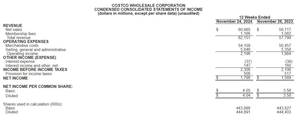 For the quarter, Costco reported a profit of $1.8 billion, or $4.04 a share, compared with $1.6 billion, or $3.58 a share, in the same period a year earlier. Excluding a tax benefit related to stock-based compensation, Costco’s earnings came in at $3.82 a share.