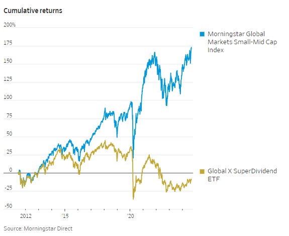 If you’d bought the ETF at its inception and held continuously through the end of August, you’d have lost 9%—after accounting for all those jumbo dividends along the way. Although the fund slightly outperformed its own benchmark of high-yielding companies, it lagged far behind global small and midsize stocks as a whole.