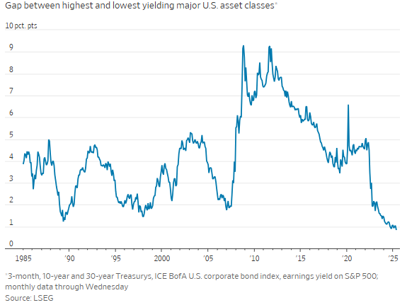 The gap between the highest and lowest yields among the main U.S. assets is the smallest in 40 years, having dropped after the election in November and stayed low. This uses the earnings yield for stocks, the earnings divided by price, or the inverse of the PE ratio, along with the yields on the three-month Treasury bill, as a proxy for cash, the 10-year and 30-year Treasurys and the ICE BofA U.S. corporate bond index.