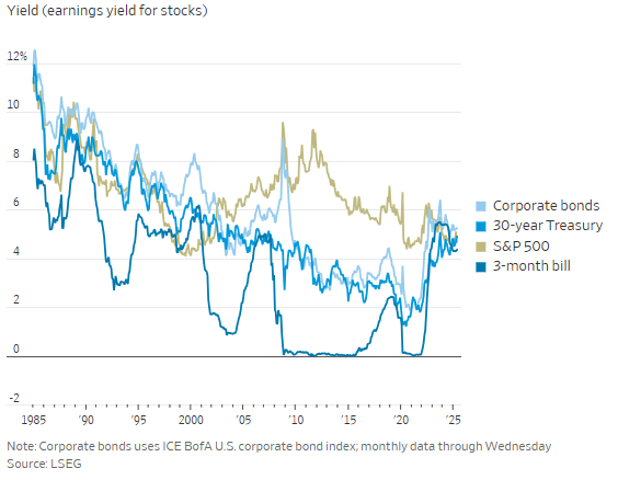 This convergence made investors a lot of money if they got it right on the way up, choosing stocks over bonds since the pandemic. But it leaves investors with a dilemma. There is little reward for locking up money in long-dated Treasurys instead of a money-market fund or bills. There is little reward for lending to big companies instead of the government. And stocks need to have reached a permanently higher rate of profit growth to justify the much-lower-than-usual extra earnings yield above Treasurys.