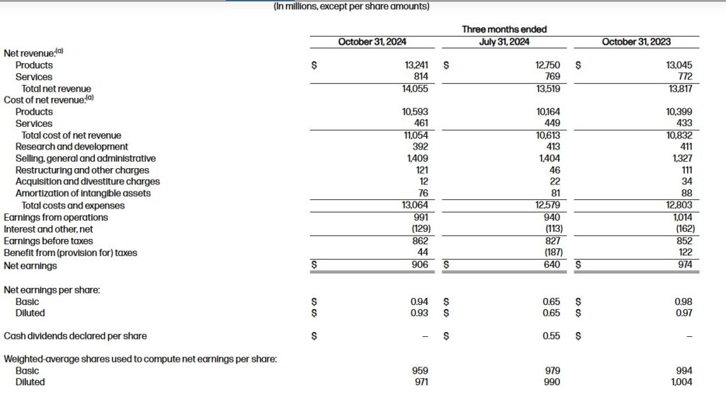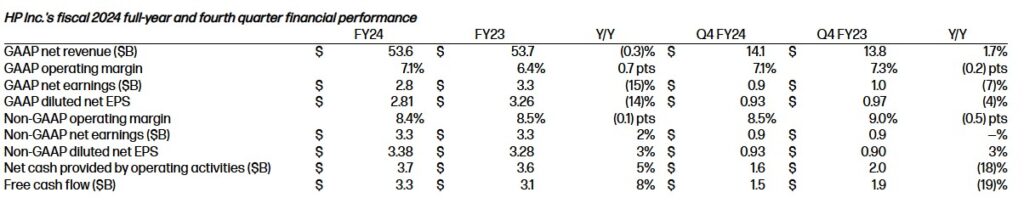 Fiscal 2024 GAAP diluted net EPS was $2.81, down from $3.26 in the prior-year and above the previously provided outlook of $2.62 to $2.72. Fiscal 2024 non-GAAP diluted net EPS was $3.38, up from $3.28 in the prior-year period and within the previously provided outlook of $3.35 to $3.45. Fiscal 2024 non-GAAP net earnings and non-GAAP diluted net EPS exclude after-tax adjustments of $564 million, or $0.57 per diluted share, related to restructuring and other charges, acquisition and divestiture charges, amortization of intangible assets, debt extinguishment costs, non-operating retirement-related credits, tax adjustments, and the related tax impact on these items.