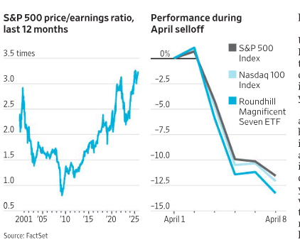 The second chart provides crucial insight into market behavior during times of stress, specifically focusing on performance during an April selloff period. The comparison between the S&P 500 Index, Russell 100 Index, and Roundhill Magnificent Seven ETF reveals important distinctions in how different market segments responded to selling pressure.