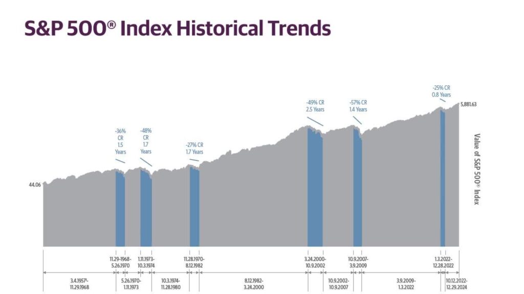 The 25-year chart of S&P 500 price-earnings ratios reveals distinct phases of market valuation cycles, each corresponding to different economic and financial market environments. Starting from 2001, the data shows initial P/E levels around 2.5 times, which reflected the market’s adjustment following the dot-com bubble collapse. This period of compressed valuations represented a market reset, where investors demanded lower prices relative to earnings as a risk premium for uncertainty.