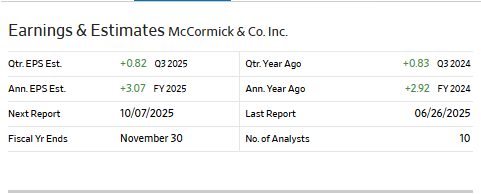 It expects adjusted operating income to grow 3-5% and increase 4-6% at constant currency. Management envisions fiscal 2025 adjusted EPS in the band of $3.03-$3.08, which indicates a 3-5% increase from the year-ago period. On a constant currency basis, the adjusted EPS is expected to increase 5-7%. On a GAAP basis, McCormick projects fiscal 2025 earnings in the range of $2.98-$3.03 per share, indicating 2-4% year-over-year growth.