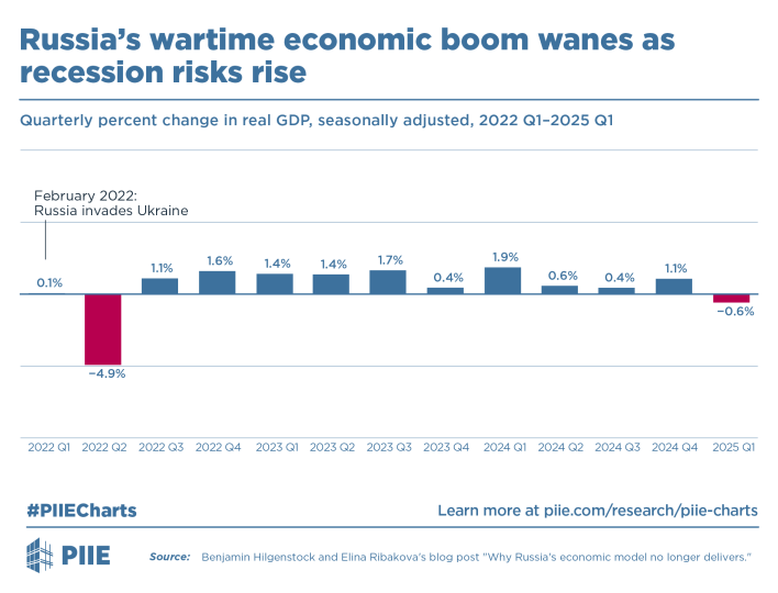 The Russian economy has undergone dramatic shifts since the onset of the war in Ukraine in February 2022. The invasion sparked a period of extreme volatility, with an immediate contraction in GDP followed by a surprising rebound fueled by wartime spending and resource exports. However, as the chart provided by the Peterson Institute for International Economics (PIIE) illustrates, this boom is beginning to wane. By early 2025, signs of economic slowdown and potential recession have emerged, raising questions about the sustainability of Russia’s wartime economic model.