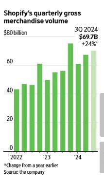 Shopify said third-quarter sales rose 26%, with gross merchandise volume, a key metric that tallies the total value of orders on Shopify, up 24% from a year ago.