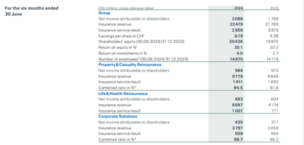 Swiss Re reported a net income of USD 2.1 billion and an ROE of 20.1% for the first half of 2024. The main drivers for this result were disciplined underwriting, low natural catastrophe claims and strong investment income.