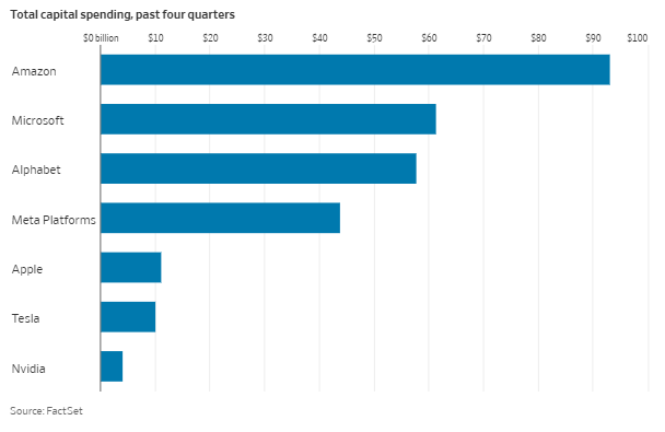 The chart illustrates a clear divide in strategies: companies like Amazon, Microsoft, Alphabet, and Meta commit massive capital to scale infrastructure and dominate AI and cloud computing, while Apple, Tesla, and Nvidia maintain more targeted investments. These trends reflect the evolving priorities of the technology sector, where cloud services, artificial intelligence, and next-generation infrastructure are the battlegrounds for future dominance.