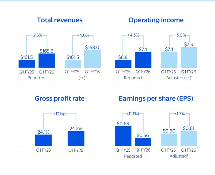 Walmart Inc. (NYSE: WMT) announces first-quarter results with steady growth in revenue and operating income. Globally, eCommerce grew 22% with digital mix up across all segments. Walmart U.S. comp sales2 up 4.5% with strong growth in health & wellness and grocery. Looking ahead, the Company issues guidance for the second quarter with net sales expected to increase 3.5% to 4.5% in constant currency . The Company’s outlook for fiscal year 2026 remains unchanged from prior guidance.