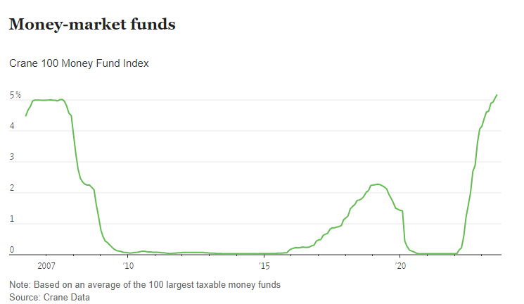 Cash in retail money-market funds has grown more than 25% this year to $1.5 trillion, according to Federal Reserve data. The average yield on the 100 largest taxable money-market funds reached 5.15%, according to Crane Data. That is the highest since 1999.