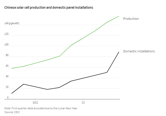 China in 2023 produced over 450 gigawatts of solar cells, according to official data. It installed less than 220 gigawatts at home—a massive figure but still less than half of what it produces.