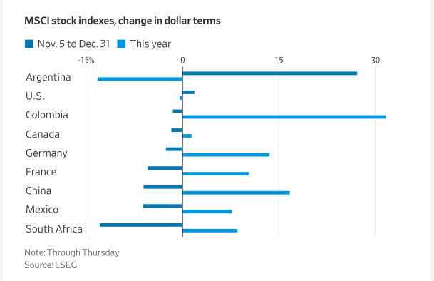Argentina’s MSCI index performance is the most dramatic, with a 15% drop from November 5 to December 31, followed by a 30% YTD gain. This volatility reflects the country’s economic rollercoaster but also its potential.