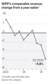 For the second quarter, WPP posted its worst quarterly decline in like-for-like revenue less pass-through costs since the Covid-19 pandemic, hurt by client losses and tariff-induced caution among marketers. The metric—a closely watched measure of its top-line performance—fell 5.8% compared with a year earlier.